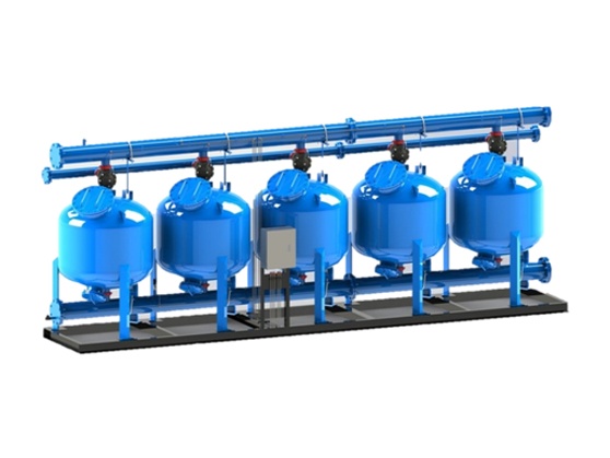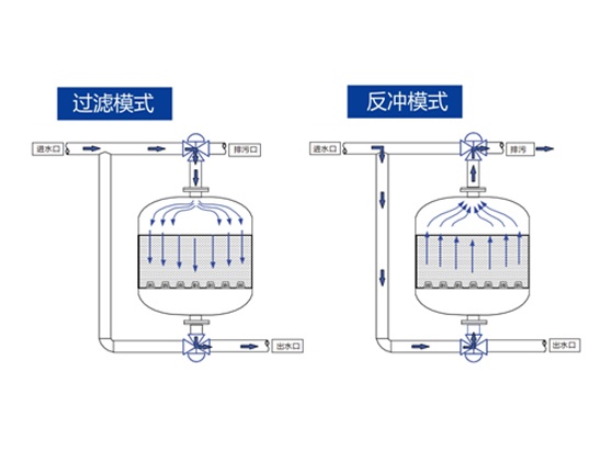 3.過濾水量大,過濾效果好,過濾流速快,正常濾速可在40m/h左右,根據(jù)水質(zhì)可達60m/h;過濾器反洗采用水,且不必設(shè)增壓泵和反洗泵;反洗歷時2-3min,反洗水量<3m3。過濾精度高,雜質(zhì)過濾精度可在0.10mm以下,出水濁度可小于0.5NTU。過濾系統(tǒng)由標準單元砂缸組成,過濾流量可從30.6m3/h增至2500m3/h。